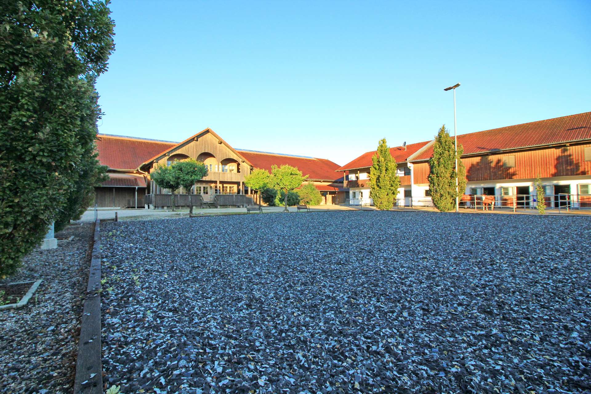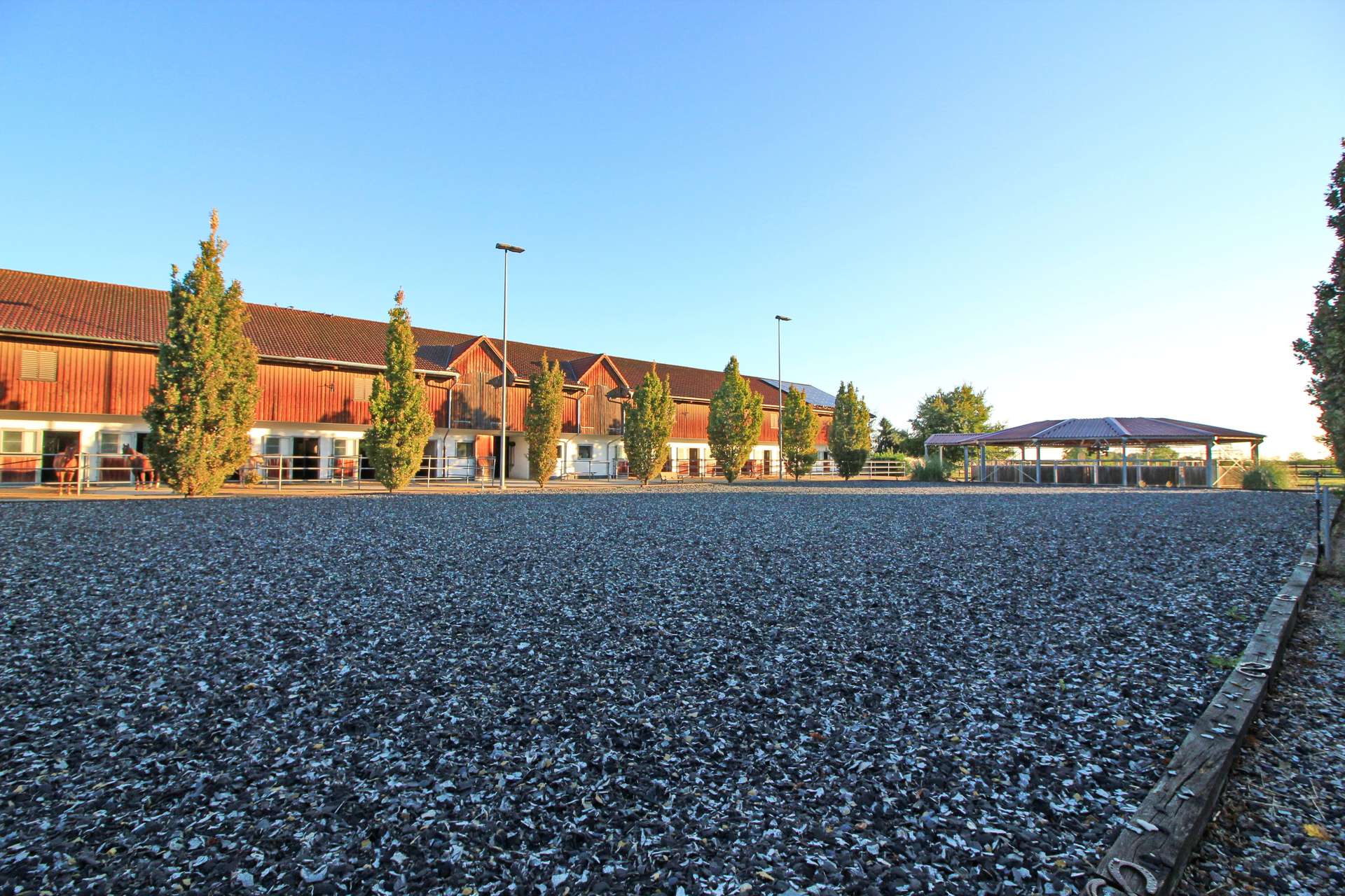 – Außenreitplatz (ca. 60 x 23 m) mit fester Tretschicht, für ganzjährige Nutzung bei fast jeder Witterung geeignet